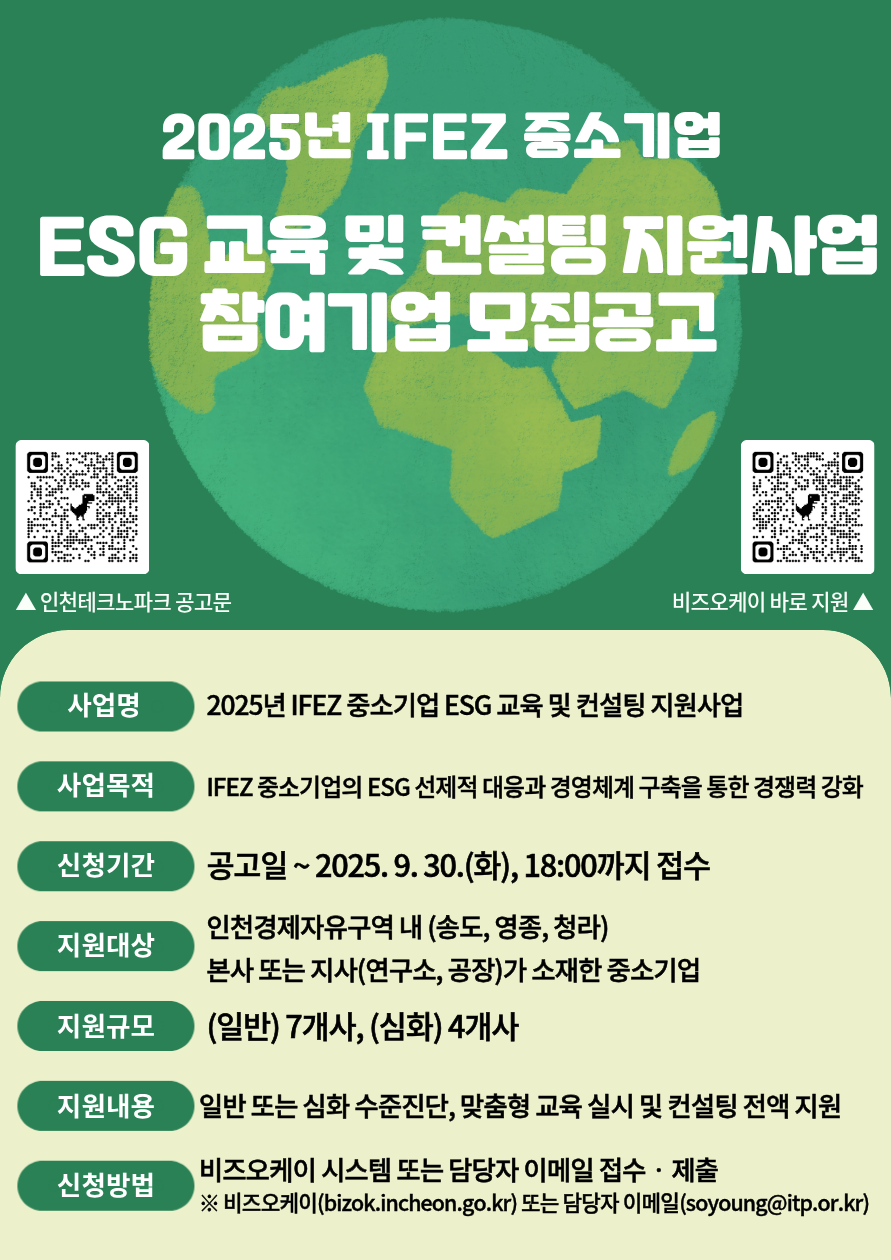 [인천테크노파크] 2025년 IFEZ 중소기업 ESG 교육 및 컨설팅 지원사업 참여기업 모집