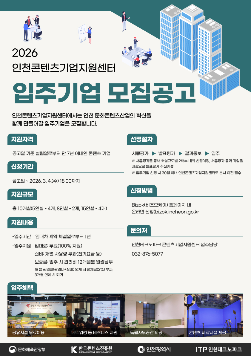 ❍ 공 고 명 : 2026년 인천콘텐츠기업지원센터 입주기업 모집공고