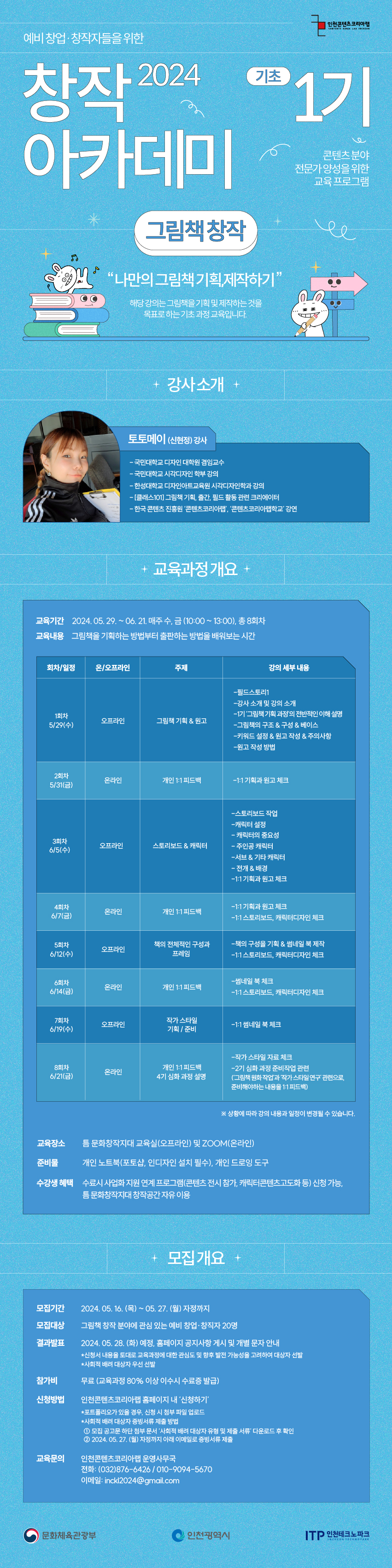 ▶ 교육문의: 인천콘텐츠코리아랩 운영사무국 032-876-6426 / 010-9094-5670 inckl2024@gmail.com